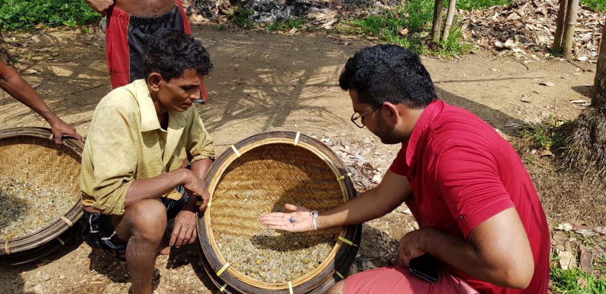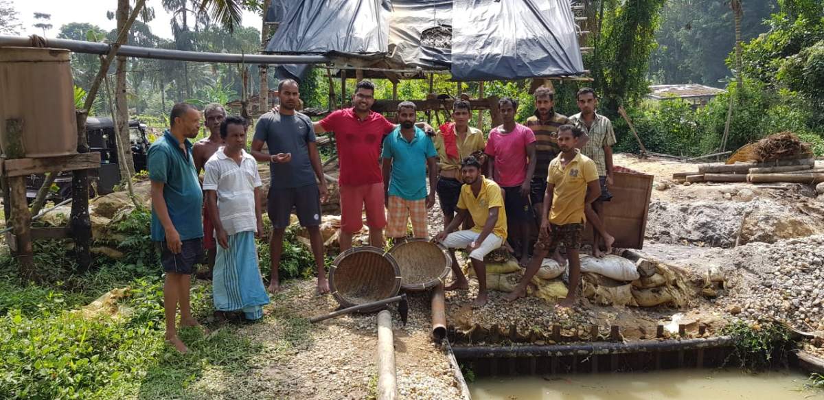 As Sri Lanka has forbidden the use of industrial machinery in order to give rural people enough work to do, these clay sediments are mined by hand, primarily by men, as it is physically demanding work. A working day is typically only from 9 am until 3:30 pm, as good light is necessary to distinguish the gemstones from the surrounding gravel. As the tropical evening light is not bright enough, the working day finishes in the afternoon.